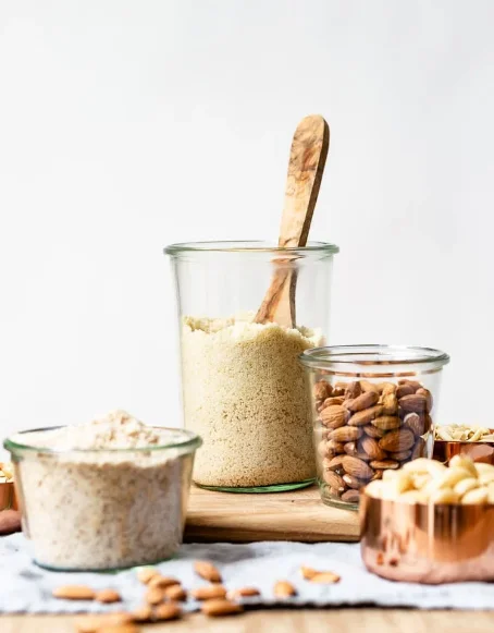 Almond powder or almond protein powder is made from almonds. The process includes blanching almonds in boiling water to remove the skins, crushing into juice, adding maltodextrin, and spray drying into powder. Almond powder is often used as an alternative to wheat flour in cooking and baking. Almond powder contains 60% almond protein.